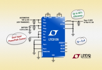 리니어테크놀로지 코리아(대표 홍사곽)는 듀얼 입력 PowerPath™ 제어 기능이 통합된 2.5A, 42V 동기식 스텝다운 스위칭 레귤레이터(제품명: LTC3126)를 출시했다. 고유의 파워 스테이지 토폴로지가 적용되어 2개의 독립 전원 중 어느 것으로든 동작이..