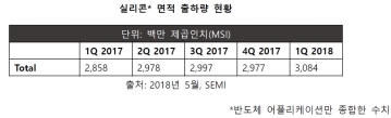 SEMI 실리콘 제조사 그룹(SMG)의 실리콘 웨이퍼 산업에 대한 분기별 분석에 따르면 전 세계 실리콘 웨이퍼 면적 출하량이 2018년 1분기에 30억 84백만 제곱인치로 분기별 사상 최대 수준을 기록하며, 2017년 4분기 29억 77백만 제곱인치 대비 3.6%, 그..