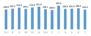 2022년 7월 ICT 수출액이 전년 동월 대비 소폭 감소했으나, 일평균 수출액은 역대 7월 수출액 중 가장 높은 실적을 기록하며 61.2억불 흑자를 달성했다.