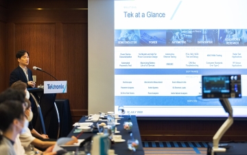 텍트로닉스는 26일 코엑스에서 미디어 컨퍼런스를 열고 신제품 2 시리즈 MSO 제품 실물 공개 및 시연회를 진행했다. 백남주 대표는 오실로스코프 신제품 ‘2 시리즈 MSO’를 소개하며, 이를 통해 한 단계 도약해 업계를 선도하겠다는 포부를 드러냈다.