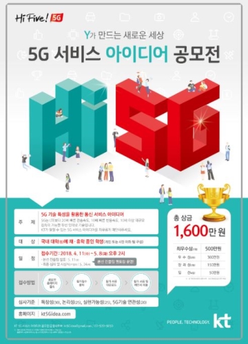 2018 평창동계올림픽에서 성공적으로 5G 시범 서비스를 선보인 KT가 대학생들과 함께 신규 5G 서비스 발굴에 나선다. KT는 전국 대학(원) 재학생을 대상으로 ‘Hi Five! 5G 아이디어 공모전’을 개최한다고 밝혔다. 공모전의 주제는 LTE 보다 ..