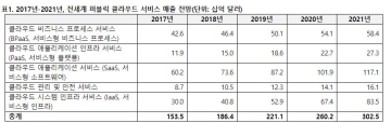 가트너는 2018년 전 세계 퍼블릭 클라우드 서비스 시장이 전년 1,535억 달러에서 21.4% 성장한 1,864억 달러에 달할 것으로 전망했다. 퍼블릭 클라우드 서비스 시장에서 가장 빠르게 성장하는 분야는 클라우드 시스템 인프라 서비스(서비스형 인프라, 이하 ..