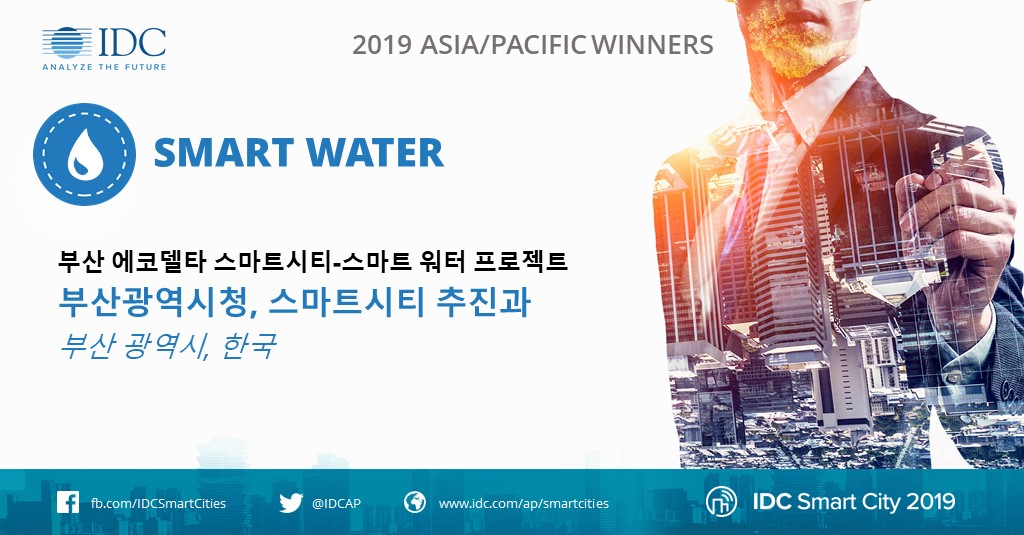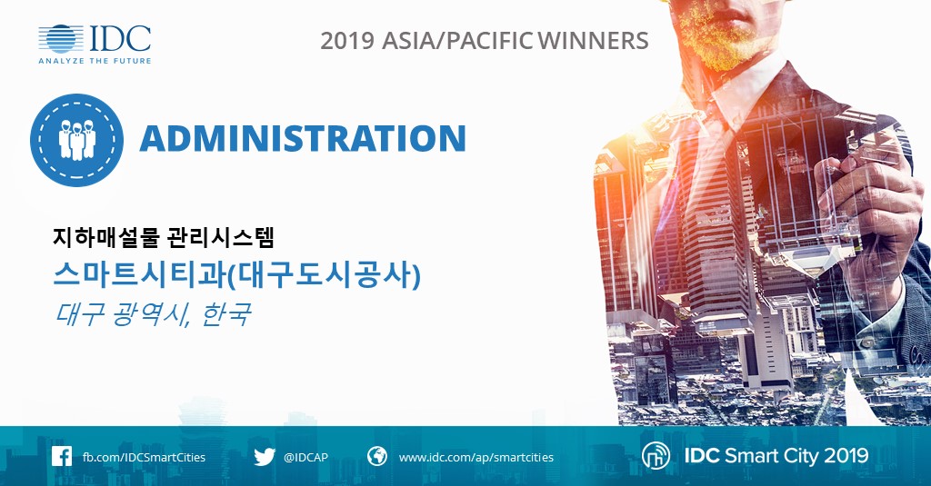 IDC가 2019 스마트 시티 아시아 태평양 어워드에서 12개의 기능별 스마트시티 수상 부문에서 총 17개의 우수 스마트 프로젝트를 선정했다. 국내에서는 대구광역시의 ‘지하매설물 관리 시스템’과 부산광역시의 ‘부산 에코델타 스마트시티-스마트워터 프로젝트’가 각각 행정, 스마트 워터 부문 최우수 프로젝트로 선정되었다. 올해 아태지역 수상자들은 다른 지역의 스마트시티 수상자들과 경쟁하여 총 12개 수상 부문에서 전 세계 최고의 스마트시티 프로젝트로 선정될 수 있는 기회를 얻는다.