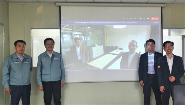 ▲왼쪽부터 HSD엔진 김영기 부장, HSD엔진 이상민 수석부장, ABB코리아 박재웅 부사장, ABB코리아 이영기 부장. 화면 속 왼쪽부터 ABB 터보차저 디지털 고객 솔루션 크리스티앙 코로토(Cristian Corotto) 수석 부사장, ABB터보차저 마케팅 및 파트너십 디지털 솔루션 영업 총괄 마우로 디 미셀리(Mauro De Micheli)기 기념촬영을 하고 있다.
