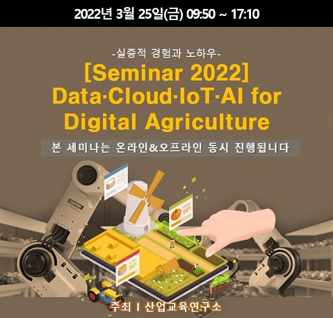 산업교육연구소는 3월25일에 ‘[Seminar 2022] Data·Cloud·IoT·AI for Digital Agriculture -실증적 경험과 노하우-‘를 온라인/오프라인 동시 개최한다.