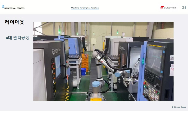 이번 웨비나의 발표를 담당한 임재익 유니버설 로봇 과장과 이정민 일렉트릭스 파트장은 유니버설 로봇의 협동로봇 시리즈와 교육프로그램, 머신텐딩 자동화 사례 등을 소개했다.
