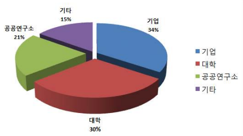 재난 대응 로봇과 관련한 출원비율을 살펴보면, 기업들의 출원이 34%로 비중이 가장 높았고, 대학이 30%, 공공연구소가 21% 및 기타 개인이 15%의 비중을 차지하고 있으나 기업, 대학 및 공공연구소들의 특허 출원 비중에 큰 차이가 없어, 이 분야에 대한 연구 개발이 산ㆍ학ㆍ연에서 균형 있게 진행되고 있음을 보여주고 있다.