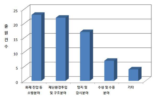 2010년 이후 특허 출원된 기술동향을 살펴보면, 화재 진압 등 소방관련 분야가 32%, 재난 환경 투입 및 구조 분야가 30%로 각각 높은 비중을 차지하였고, 탐지 및 감시분야가 23%, 수상 및 수중 분야가 10%, 기타 5%를 차지하였으며, 해난 사고와 관련한 수상 및 수중 분야에 대한 특허도 꾸준히 출원되고 있다.