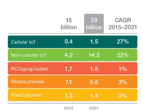 2015년에서 2021년 사이에 셀룰러 IoT는 가장 높은 성장률을 보일 것이며, IoT 커넥티드 기기의 수는 연평균 23%로 성장할 것으로 예상된다. 2021년까지 약 280억 개의 커넥티드 기기가 생겨나고 이 중 IoT 기기는 약 160억 개에 달할 것이다.