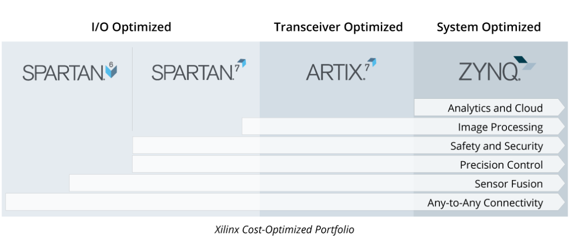 자일링스의 확장된 스파르탄(Spartan)®, 아틱스(Artix)®, 징크(Zynq)® 제품군은 차세대 완벽한 연결성(any-to-any connectivity), 센서 융합, 정밀 제어, 이미지 프로세싱, 분석, 안전 및 보안 기능을 지원한다.