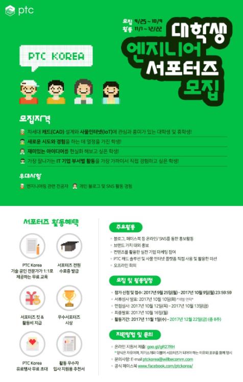 자격 조건은 차세대 CAD 설계 및 IoT에 대한 관심과 흥미를 바탕으로 새로운 아이디어를 도전해 보고자 하는 학생이면 누구나 가능하며, 특히 엔지니어링 관련 전공자는 우대적으로 선발되어 현장 업무를 경험해 볼 수 있다. 모집 인원은 20명으로, 9월 25일부터 10월 9일까지 2주간 신청할 수 있으며, 서포터즈로 선정된 학생들은 오는 11월부터 8주간 PTC코리아 서포터즈로 활동하게 된다.