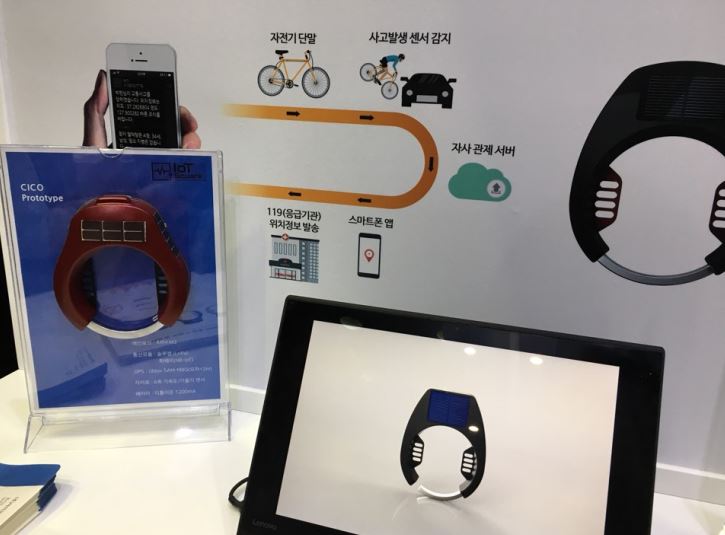 이륜 자동차, 자전거의 사고 여부를 판단해 119에 위치정보를 발송하는 eCall서비스도 스타트업 부스에 전시됐다. 일반 잠금 열쇠처럼 생긴 단말기에 탑재된 자이로센서는 사고 발생시 20초내 교통사고를 감지한다. 아직까진 넘어진 때와 사고를 구분하지 못해 원치 않을 경우 20초 이내에 취소 버튼을 눌러야 한다.