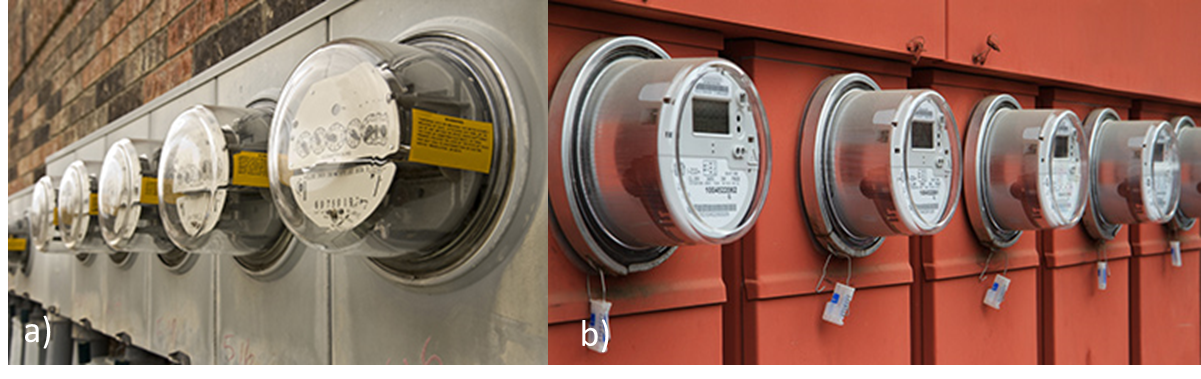 그림 1a에서 보듯이 기계식 전기계량기는 회전 디스크와 게이지에 의해 판별되는 반면, 그림 1b의 e미터는 LCD를 통해 판독할 수 있다.