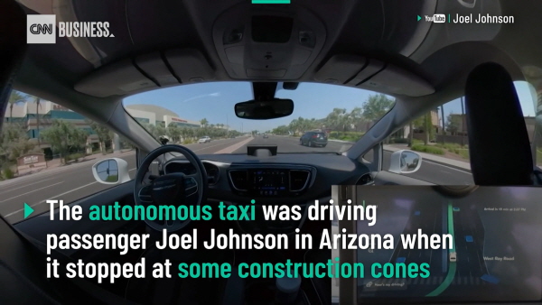▲ 웨이모 차량이 라바콘을 앞에 두고 정지했다 (출처: CNN 영상 캡쳐)