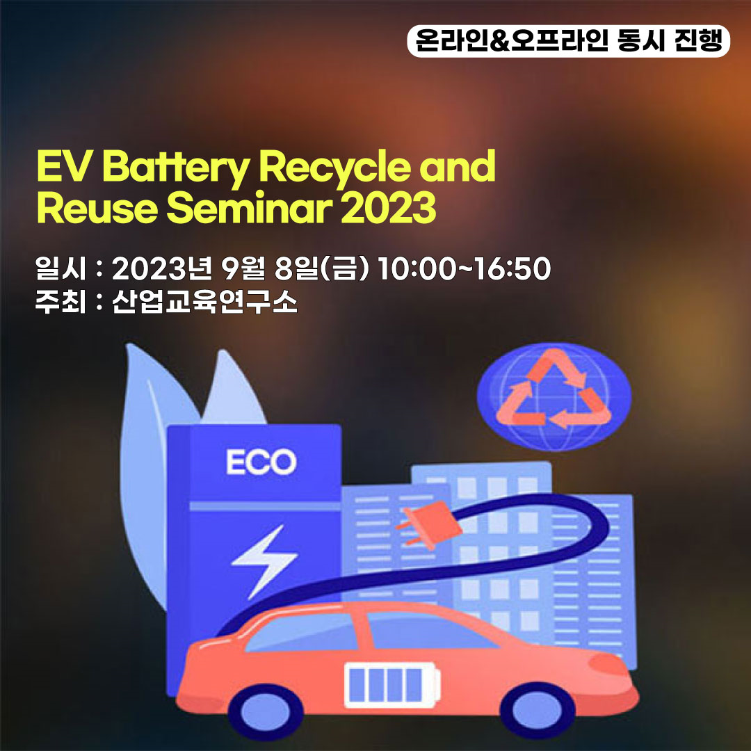 산업교육연구소는 오는 9월 8일(금)에 “EV Battery Recycle and Reuse Seminar 2023”를 온라인, 오프라인 동시 개최한다고 밝혔다.