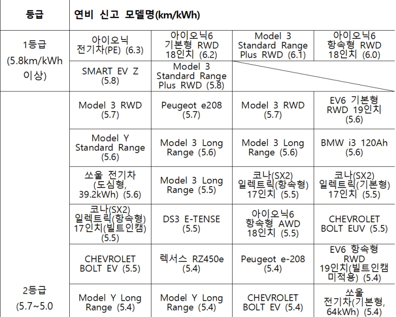 등급 기준은 △1등급 5.8km/kWh 이상 △2등급 5.7~5.0km/kWh △3등급 4.9~4.2km/kWh △4등급 4.1~3.4km/kWh △5등급 3.3km/kWh 이하다.