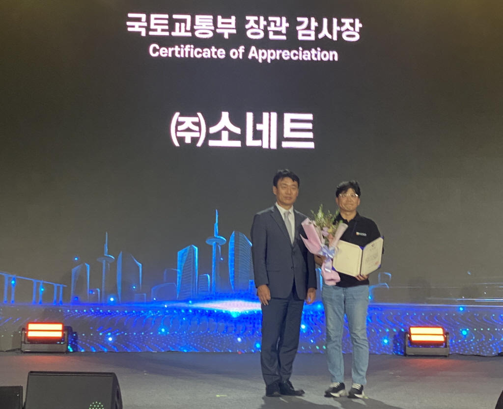 소네트(대표이사 차두원)가 무인자율주행기술 수용성 향상 및 저변 확대에 기여한 공로를 인정받아 지난 9월3일부터 5일까지 경기도 고양시 킨텍스에서 개최된 월드스마트시티엑스포 (WSCE) 2024에서 국토부장관 감사장을 수여 받았다.