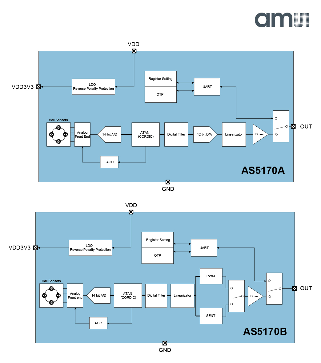 신제품 AS5170 및 AS5171 센서는 ISO26262 기능안전 표준이 정의한 것처럼SEooC(Safety Element out of Context) 제품 용도로 개발되었다. AS517x 부품들은 전체 데이터 경로 진단을 제공하는, ams의 마그네틱 위치 센서로 자동차 시스템 OEM 업체들은 ISO26262 시스템급 수준을 달성할 수 있다.