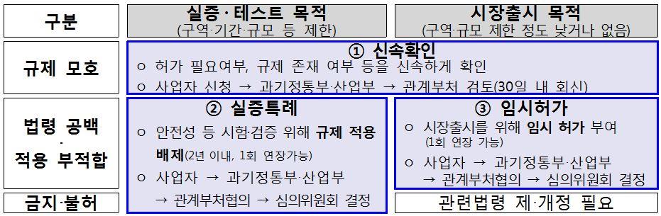 규제 샌드박스는 빠르게 창출되고 있는 신기술 및 서비스가 국민의 생명과 안전에 저해되지 않을 경우, 기존 법령이나 규제에도 불구하고, 실증(실증특례) 또는 시장 출시(임시허가)할 수 있도록 지원하는 제도다.