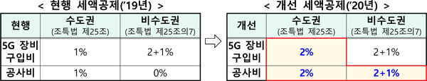 정부는 민간의 5G 투자를 촉진하기 위해 2019년부터 2년간 5G 망 투자 세액공제를 추진 중이며, 올해부터는 세액공제율(수도권 지역)과 대상(비수도권 지역)을 확대한다.