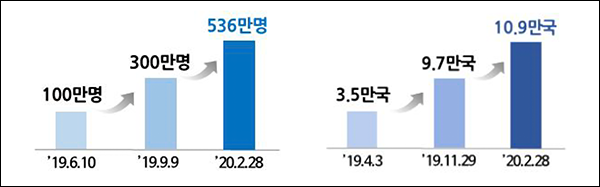 국내 5G 가입자는 상용화 약 10개월 만에 500만 명을 넘었으며, 5G 기지국은 전국 85개 시 10만9천여 곳에 구축됐다.