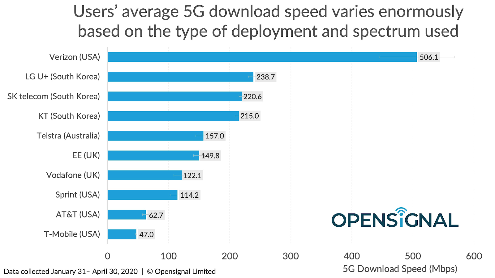 측정 결과 버라이즌이 초당 506.1Mbps(메가비트)로 1위를 차지했고, LG유플러스(238.7Mbps), SK텔레콤(220.6Mbps), KT(215.0Mbps) 순이었다. 버라이즌은 대용량 데이터 송수신에 적합한 28GHz 대역을 쓰고 있으며 국내 이통 3사는 그에 못 미치는 3.5GHz 대역을 쓰고 있다.