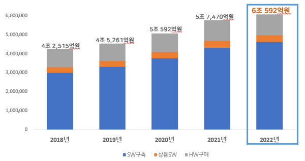 조사결과 2022년 공공부문 소프트웨어·정보통신기술 장비 총 사업금액 확정치는 6조592억원으로 전년 확정치 대비 3,122억원 규모 5.4% 증가한 것으로 조사됐다.