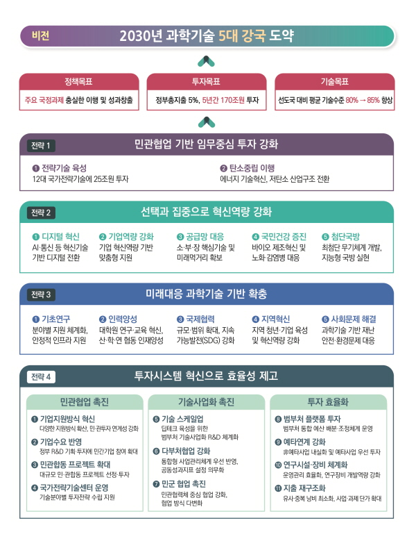 ‘2030년 과학기술 5대 강국 도약’을 비전으로, 5년간 170조원의 정부 연구개발예산을 투자하는 것을 목표로 제시했고 이를 통해 주요 국정과제를 충실히 이행해 최고 기술 선도국 대비 기술수준을 현재 80% 수준에서 85%로 높일 계획이다.
