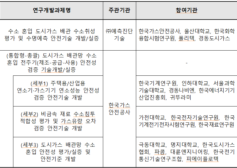기존 도시가스에 수소를 혼입하여 공급하는 것은 안전 확보가 선행되어야 하므로 국민들이 가정에서 사용하는 가스시설(보일러, 가스레인지 등)을 포함한 수소 혼입 전주기(제조-공급-사용) 안전성 검증 등 기술 개발에 총 280억원을 투자하여 2026년까지 선제적으로 안전기준을 마련할 예정이다.