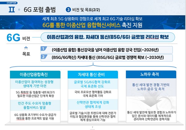 6G포럼의 비전 및 목표는 5G 이종산업 융합 강국 진입과 6G 차세대 통신 글로벌 경쟁력 확보에 있다.