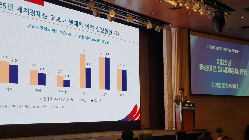 이날 발표를 진행한 이시욱 대외경제정책연구원 원장은 2025년 세계 경제 성장률 3.0으로 2024년 3.1과 거의 비슷할 것으로 내다봤다.
