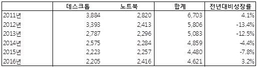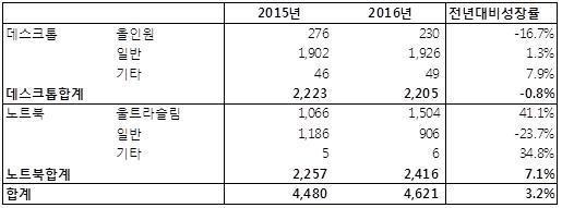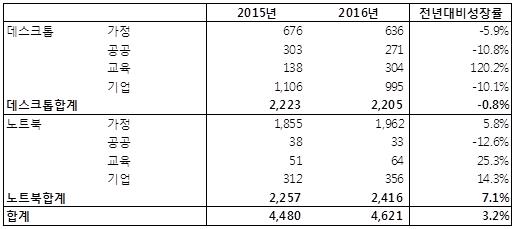 "2016년 전세계 PC 출하량도 5.7% 감소한 점을 고려하면 2016년 국내 PC 시장 성장은 주목할만 하다."