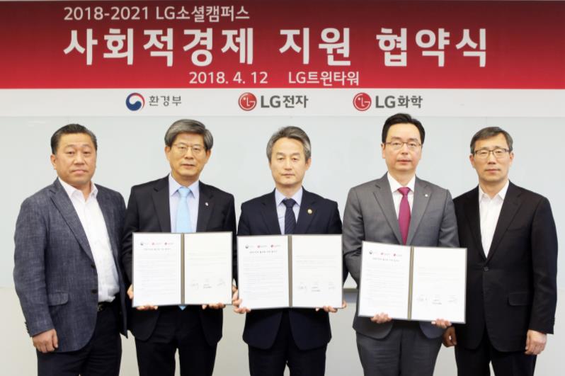 양사와 환경부는 서울 여의도 LG트윈타워에서 친환경 분야 사회적경제를 활성화하기 위한 협약(MOU)을 체결했다. 이 자리에는 환경부 안병옥 차관, LG전자 이충학 부사장, LG전자 배상호 노조위원장, LG화학 박준성 상무, 한국사회적기업진흥원 김종각 기획관리본부장 등이 참석했다.