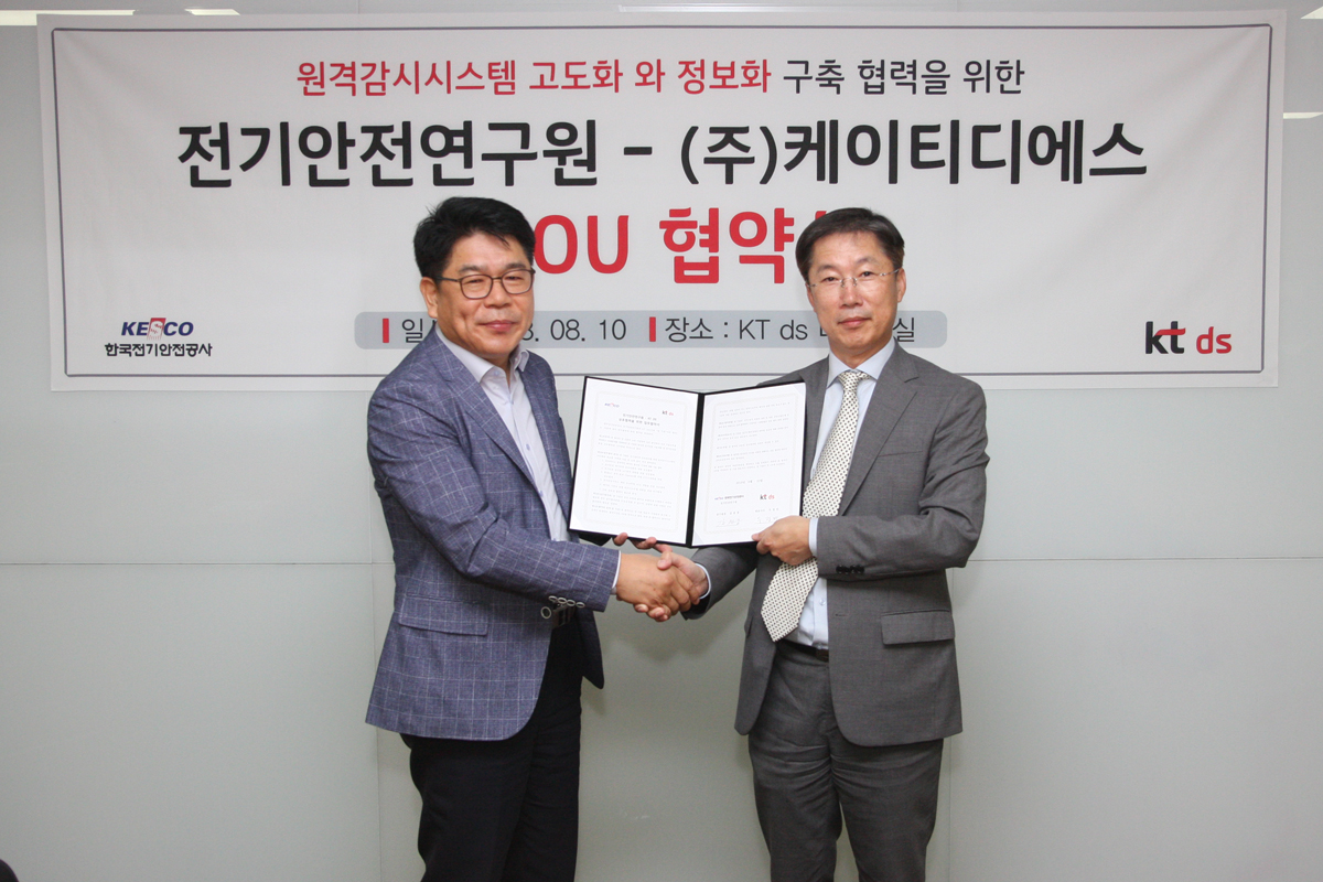 KT DS와 한국전기안전공사 전기안전연구원은 8월 10일 서울 서초구 KT DS 본사 사옥에서 ‘전기설비 안전 및 화재 예방을 위한 지능형 원격 감시 시스템 고도화 및 정보화 구축’을 위한 상호 업무협약(MOU)을 체결했다.