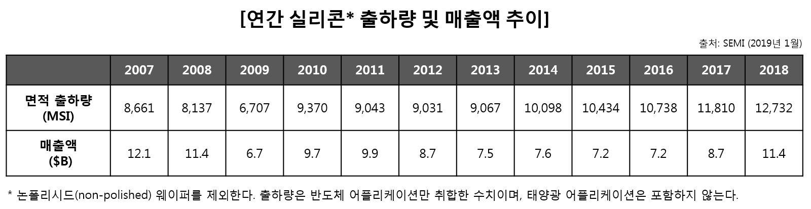 SEMI SMG가 연말 조사를 통해 2018년 실리콘 웨이퍼 면적 출하량이 127억 3200만 제곱 인치(MSI)로 2017년의 118억 천만 제곱 인치에 비해 8% 증가하였으며, 2018년 매출액은 2017년의 87억 7000만 달러에서 약 31% 증가한 113억 8000만 달러를 기록하였다고 밝혔다.