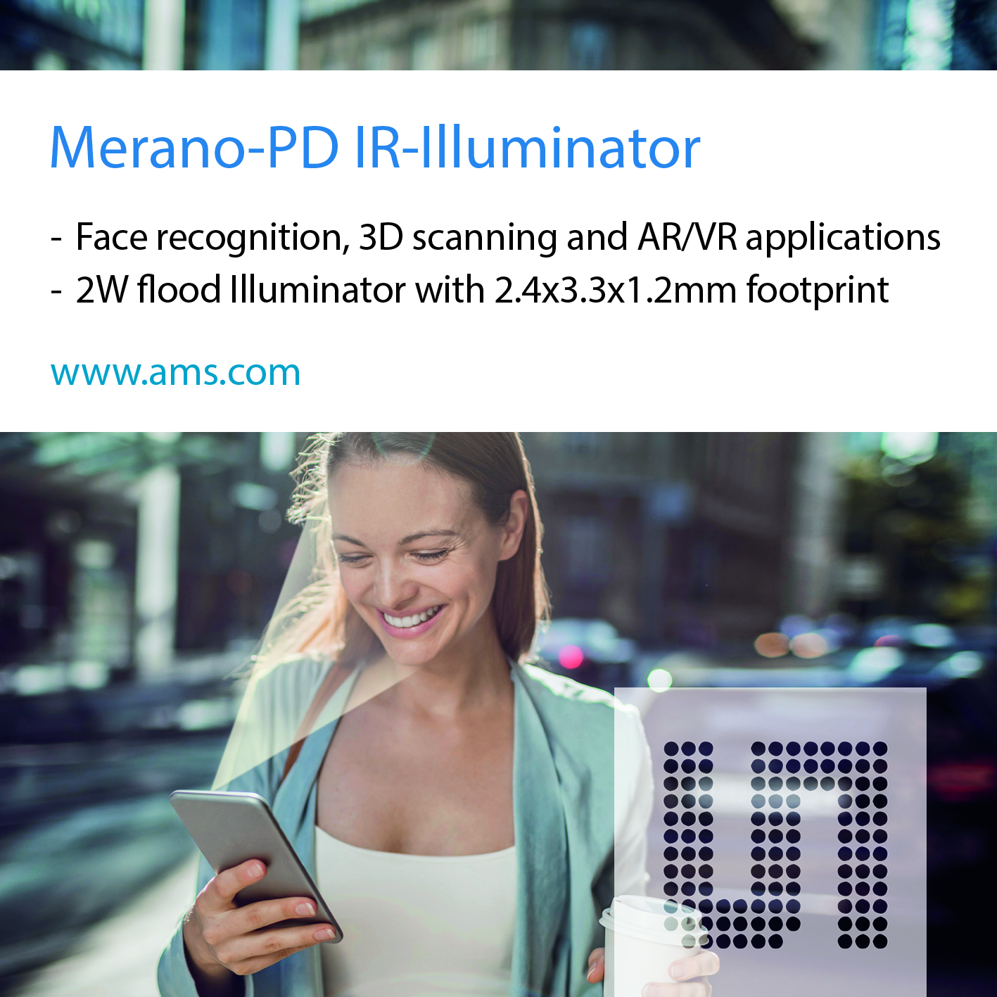 ams가 사용자 얼굴인식 같은 모바일 3D 센싱 애플리케이션에 균일한 조명 출력을 제공하는 적외선(IR) 레이저 투광 조명(flood illuminator) 모듈 ‘MERANO-PD(photodiode)’를 출시한다고 25일 밝혔다.