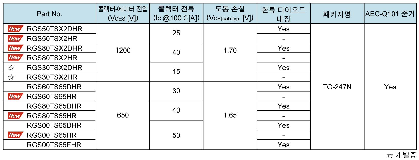 이번에 1200V 내압 제품을 4기종 출시함에 따라 로옴은 650V 내압 제품을 포함한 총 11종의 제품을 구비하게 됐다. 로옴은 IGBT 단품과 환류 다이오드 내장 타입을 구비하고 있으므로 고객은 최적의 디바이스를 선정할 수 있다.