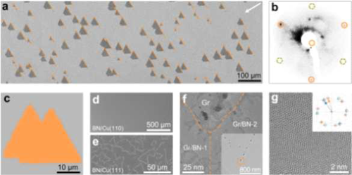 2차원 단결정 육방정계 질화붕소(h-BN)의 성장과정: 그림(a)는 단결정 구리(Cu) 금속 포일 위에 놓인 일정 방향성의 원자 배열을 갖는 h-BN 단결정의 모습이다. 질소(N)와 붕소(B)가 이루는 기본 단위가 삼각형 형태임을 확인할 수 있다. 연구진은 여러 분석 장비를 이용해 분석 결과, 구리 금속 포일에서 성장시킨 2차원 h-BN이 원자의 배열과 배향이 일정한 단결정 형태임을 확인했다