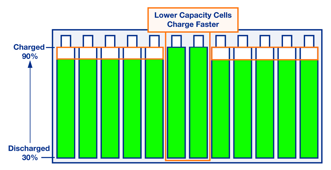 그림 1의 다이어그램은 통상적인 배터리 스택에서 모든 셀들이 최대 용량에서부터 시작하는 것을 보여준다. 이 그림에서 최대 용량은 90% 충전으로 표시되어 있다. 배터리를 장기간 거의 100%에 가까운 용량으로 유지하면 수명이 빠르게 줄어들기 때문이다. 최대로 방전했을 때는 30%로서, 이것은 과방전을 방지하기 위해서다.