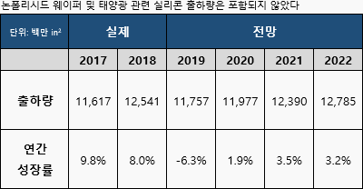 한편, 이번 발표에 인용된 데이터에는 버진 테스트(virgin test) 웨이퍼, 에피택셜 실리콘(epitaxial silicon) 웨이퍼와 같은 폴리시드 실리콘(polished silicon) 웨이퍼가 포함되어 있으며, 논폴리시드(Non-Polished) 웨이퍼와 재생(Reclaimed) 웨이퍼는 포함하지 않았다.