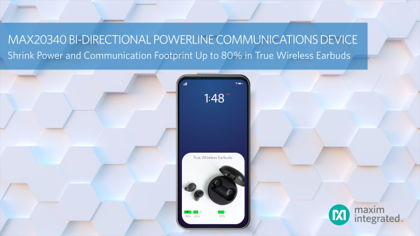 맥심이 양방향 DC 전력선 통신(PLC) IC MAX20340을 출시했다. 저전력 휴대기기 및 웨어러블 설계자들은 MAX20340을 사용하여 충전기에 연결되는 전원 통신과 인터페이스 크기를 줄일 수 있다. MAX20340은 하나의 선으로 전원 공급과 통신 기능을 모두 수행한다. 충전 도크, 무선 이어폰, 소형 웨어러블 등의 저전력 제품 간 통신에 요구되는 핀과 개별 소자가 필요 없다.