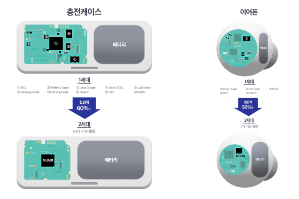 이번에 선보인 PMIC는 충전케이스용 'MUA01'과 이어폰용 'MUB01'다. 각각 10개, 5개 내외의 다양한 칩들을 하나로 통합하여 더 넓은 배터리 공간을 설계할 수 있게 한다.