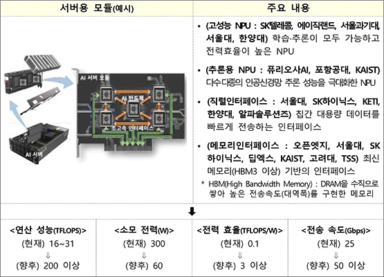먼저 서버 분야에서는 SK텔레콤을 비롯한 15개 기관이 참여한 컨소시엄이 최대 8년간 총 708억 원을 투입하여 클라우드 데이터 센터 등 고성능 서버에 활용 가능한 NPU와 인터페이스를 개발한다.