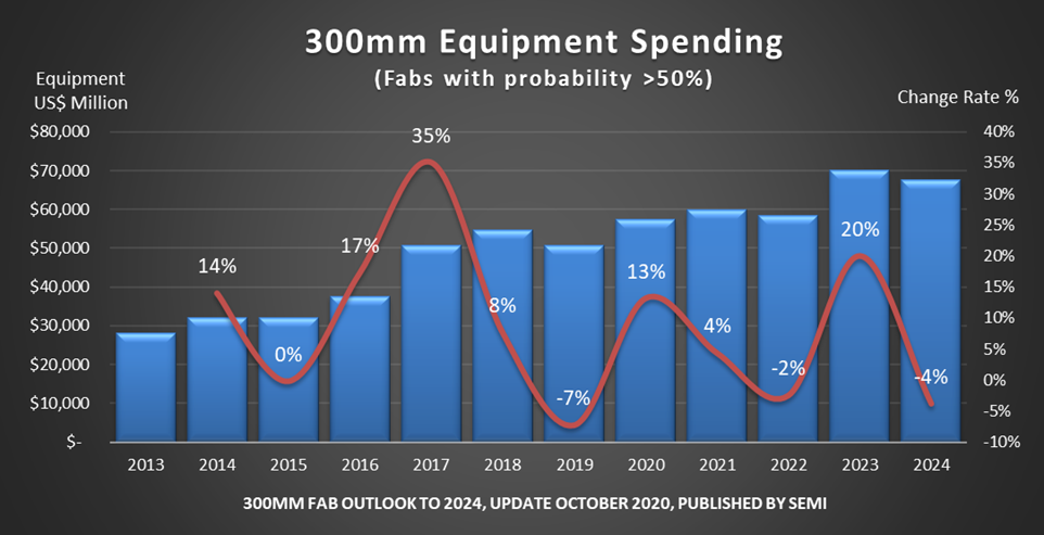 SEMI의 300mm 팹 전망 보고서는 올해부터 2024년까지 최소 34개의 신규 300mm 팹이 건설될 것으로 예상했다. 이 기간에 월간 팹 생산량에 대해서 약 180만 달러가 투자되어 월 웨이퍼 생산량은 2024년 700만 장을 넘어설 것으로 보인다.