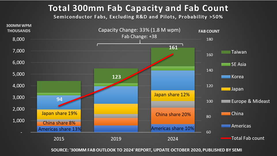 신규 팹 중 11개는 대만, 8개는 중국에서 건설되며, 이는 전체 신규 팹의 절반을 차지하는 수치이다. 2024년까지 300mm 팹은 전 세계적으로 161개가 될 것으로 보인다.