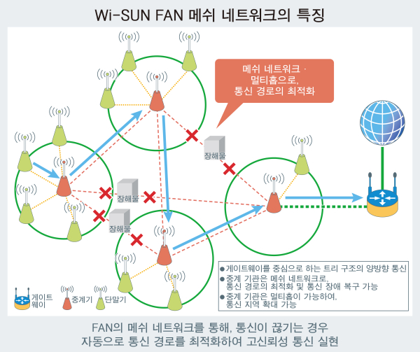 Wi-SUN FAN(Field Area Network)은 국제 무선 통신 규격인 ‘Wi-SUN’의 최신 규격으로, 다른 LPWA(Low Power Wide Area)와 달리 통신 비용이 발생하지 않고, 멀티홉(중계) 통신으로 자동으로 전파 상황을 모니터링, 접속처 전환이 가능한 신뢰성을 갖췄다.