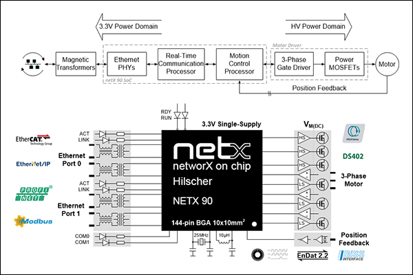 고집적 네트워크 칩인 netX 90은 전력 효율적인 설계와 확장된 온도 범위로 혹독한 산업 환경의 엄격한 애플리케이션 요건에 부합한다.또한 3상 PMSM, BLDC 모터를 위해, 홀, 인코더, 리졸버 포지션 피드백을 이용하는 FOC 기반 모터 제어 시스템 설계에, 짧은 지연시간의 결정론적, 네트워크 동기화 솔루션을 제공한다.