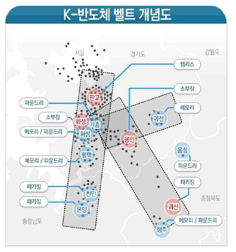 K-반도체 벨트는 판교와 기흥∼화성∼평택∼온양의 서쪽, 이천∼청주의 동쪽이 용인에서 연결된다.