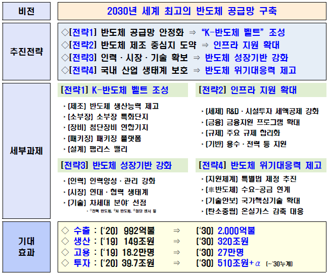 정부가 종합 반도체 강국 실현을 위해 2030년까지 510조원 이상의 압도적 민간투자로 세계 최대·최첨단 반도체 공급망을 완성한다.