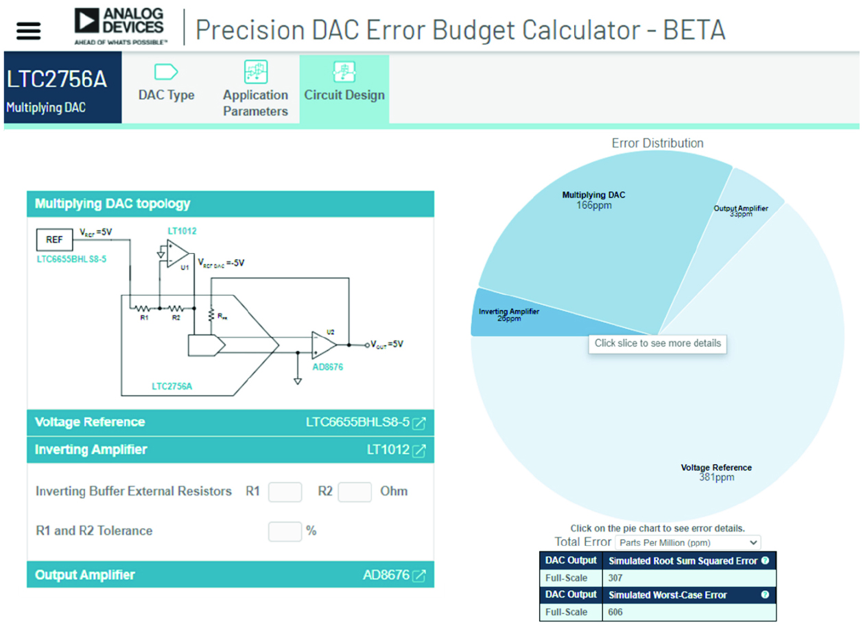 정밀 DAC 오차율 계산기(Precision Error Budget Calculator)는 개발자가 애플리케이션에 가장 적합한 부품을 선택할 수 있도록 돕는다. 통상적으로 DAC는 신호 체인에 단독 사용되지 않고, 전압 레퍼런스와, 레퍼런스 버퍼로서 사용되는 연산 증폭기와 연결된다. 추가 부품들의 오차는 각각 계산해서 더해야 한다.